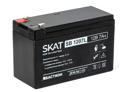 Аккумулятор герметичный свинцово-кислотный необслуживаемый SKAT SB 1207L, производимый по технологии AGM с системой рекомбинации газов VLRA, предназначен для использования в составе системы резервного питания. 12В, 7Ач, максимальный ток заряда 2,1 А. Тип клеммы — F1 нож.