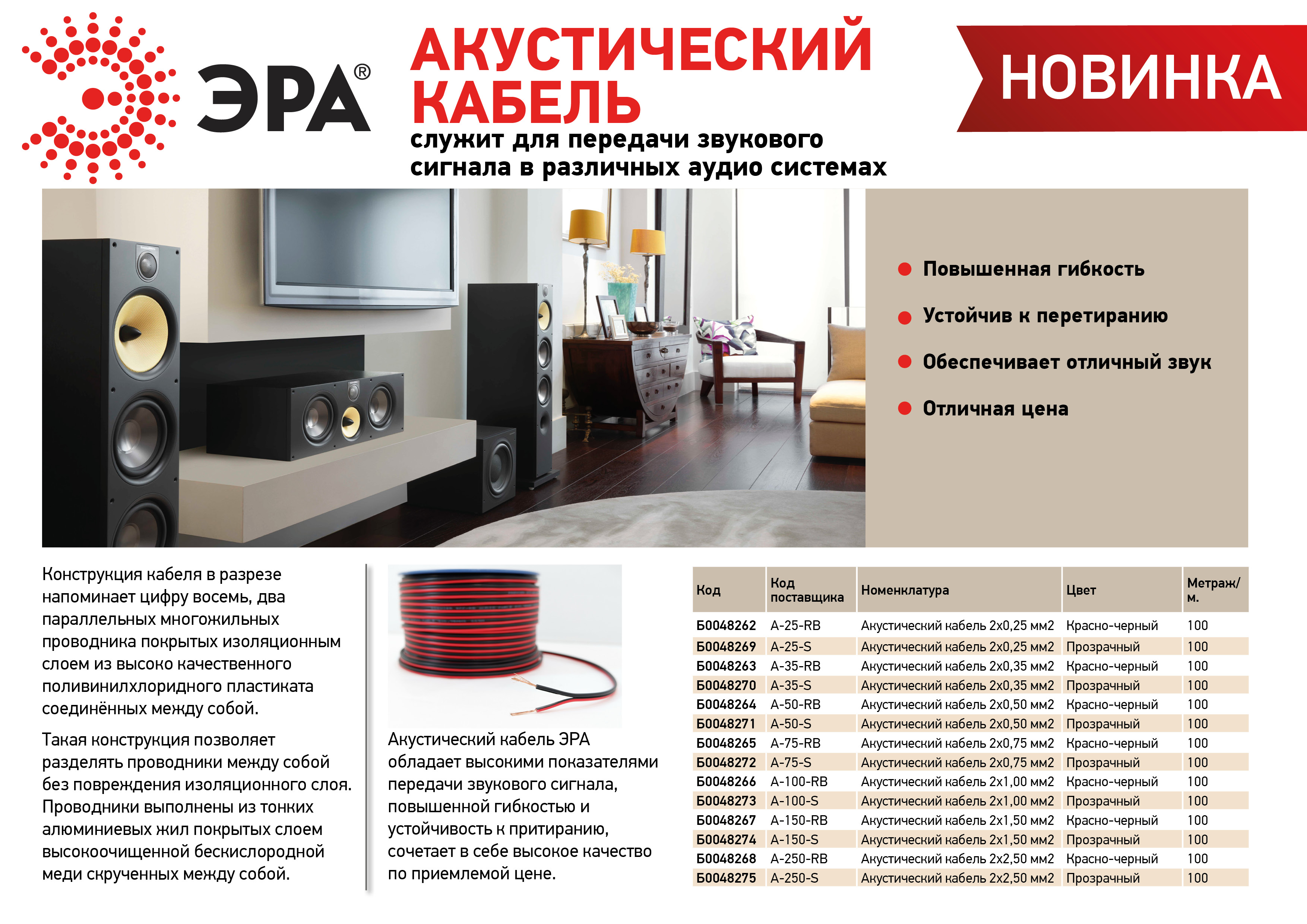 Акустический кабель Эра служит для передачи звукового сигнала в различных аудио системах. Конструкция кабеля в разрезе напоминает цифру восемь, два параллельных многожильных проводника покрытых изоляционным слоем из высококачественного поливинилхлоридного пластиката соединённых между собой. Такая конструкция позволяет разделять проводники между собой без повреждения изоляционного слоя. Проводники выполнены из тонких алюминиевых жил покрытых слоем высокоочищенной бескислородной меди скрученных между собой. Акустический кабель ЭРА обладает высокими показателями передачи звукового сигнала, повышенной гибкостью и устойчивость к притиранию, сочетает в себе высокое качество по приемлемой цене.