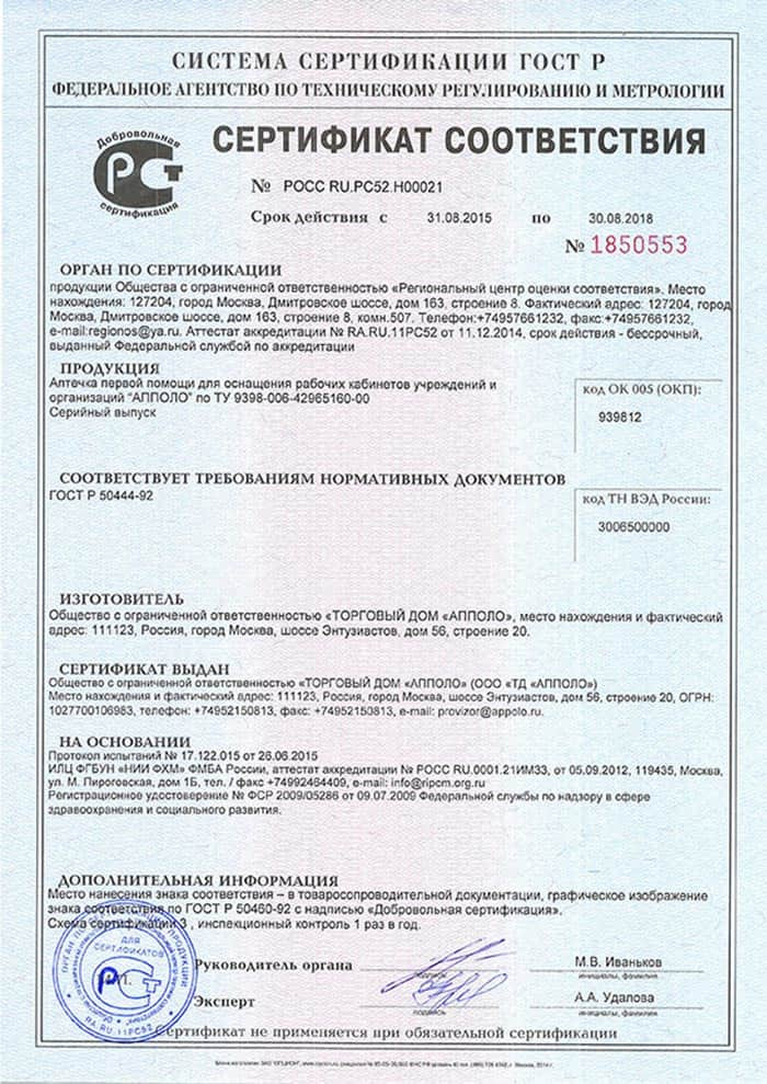 Аптечка зарегистрирована в установленном порядке федеральной службой Росздравнадзора.