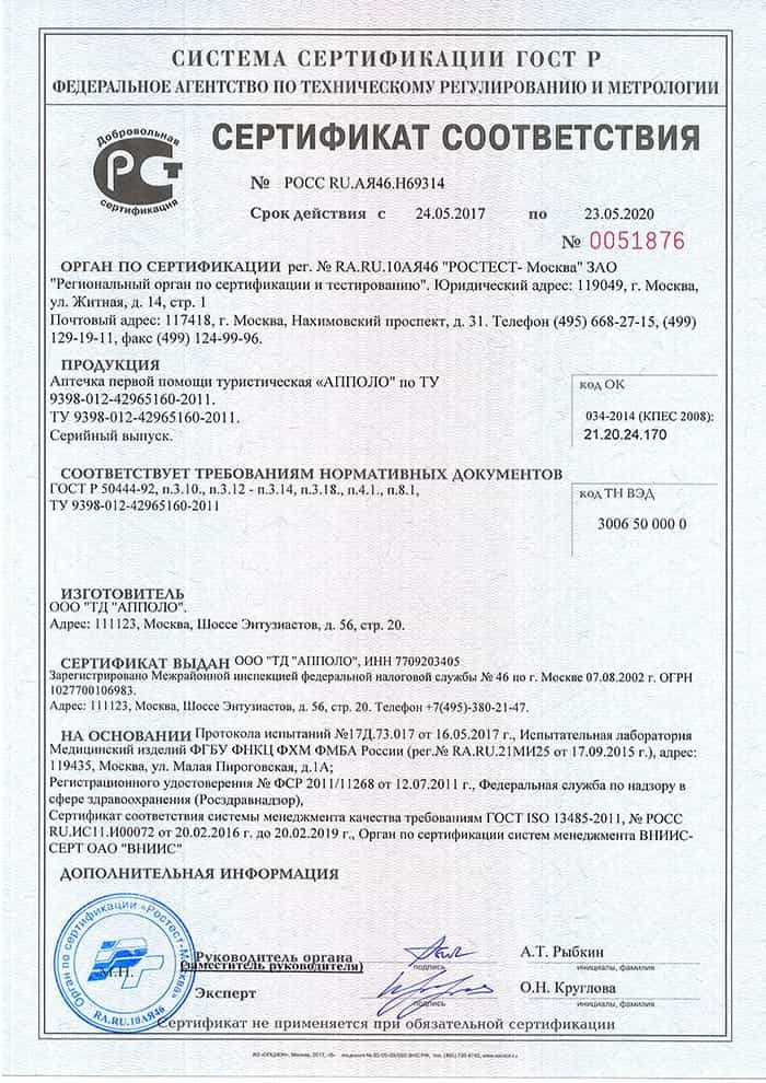 Наименование медицинского изделия по регистрационному удостоверению: Аптечка первой помощи туристическая "АППОЛО".