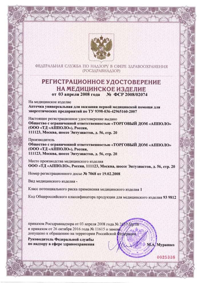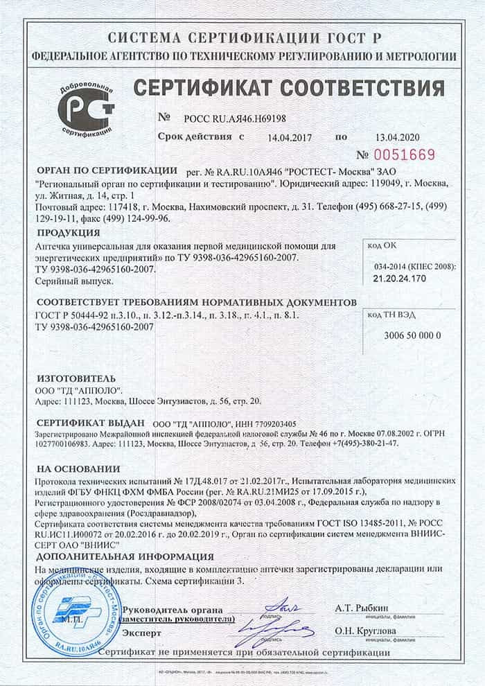 Состав аптечки разработан согласно Инструкции РАО "ЕЭС" по оказанию первой помощи при несчастных случаях на производстве.