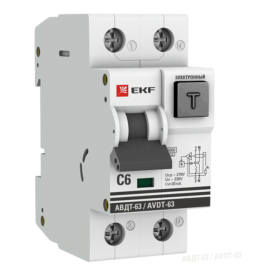Полное описание товара Автоматический выключатель дифференциального тока АВДТ-63 2п 6А 30мА С (EKF) DA63-6-30e