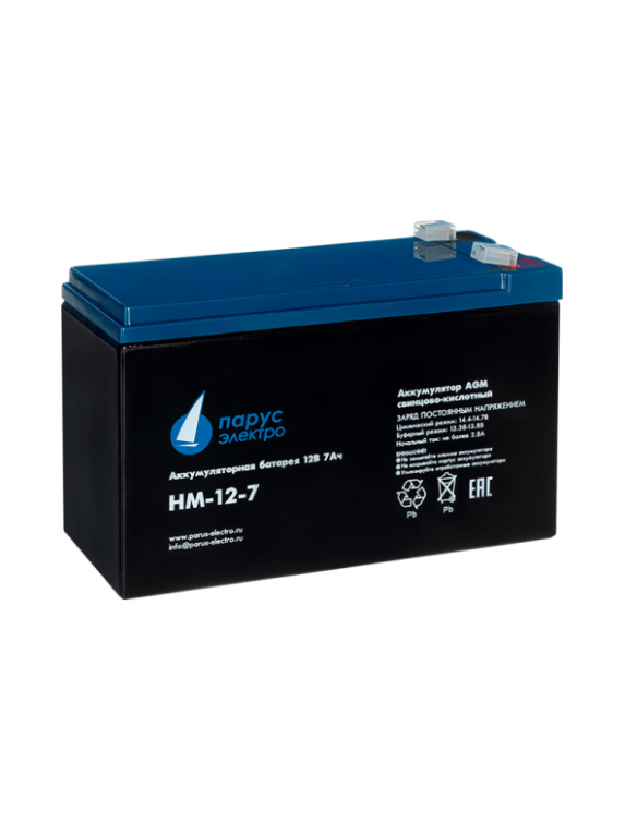 Свинцово-кислотная аккумуляторная батарея HM-12-7 по технологии AGM для циклического режима работы. Применяется в различных системах бесперебойного питания, требовательных электрических приборах (насосах и котлах систем отопления), аварийном энергоснабжении, переносных приборах, а также в стационарных системах с резервным питанием. Электролит заключен в сепараторах между пластин и всегда остается неподвижным, что позволяет эксплуатировать АКБ в любом положении. Напряжение - 12 В, ёмкость - 7.2 Ач.