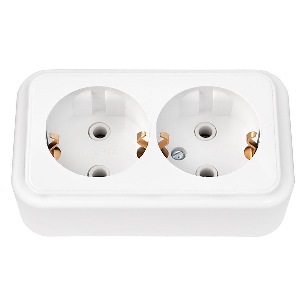 Розетка двухместная с заземляющим контактом открытой установки, предназначена для присоединения электрических приемников с номинальным напряжением 250 В к электрической сети переменного тока. В качестве материала для производства изделия использовался специальный очень прочный и экологически безопасный полимер. Изделие надёжно защищено от разрушительного воздействия ультрафиолетового излучения, не претерпевает видимых изменений при постоянных многочисленных эксплуатационных контактах. Надёжная контактная группа. Изделие выдерживает 20 А