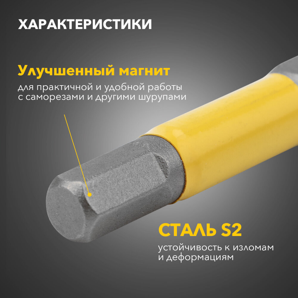 - Преимущества: Улучшенная форма биты, эффективная передача вращения крепежу|Улучшенная магнитность биты для более удобной работы с саморезами и другими шурупами|Повышенная твердость стали - высокий ресурс биты