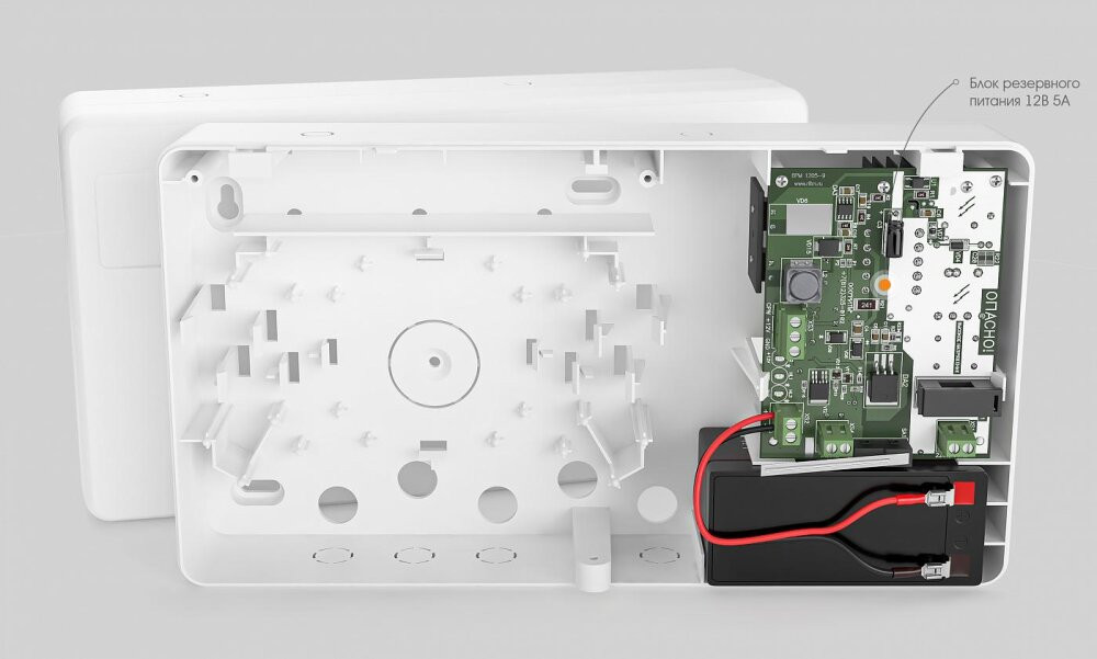 Блок резервного питания 12В 5А в корпусе ''Контакт'' под АКБ 1,2 Ач (далее — источник питания) предназначен для питания устройств компании ''Ритм'' постоянным напряжением 14 В с максимальным током нагрузки 4.5 А. При подключении к контрольной панели увеличивает количество вводов электропитания - источник питания работает от сети переменного напряжения 230 В (основное питание) и постоянного напряжения 12 В (резервное питание). В качестве резервного питания может использоваться свинцовая аккумуляторная батарея. Источник питания осуществляет автоматическое переключение электропитания с основного ввода на резервный при пропадании напряжения на основном вводе,и обратно. Источник питания производит подзарядку аккумуляторной батареи, используемой в качестве резервного источника питания.