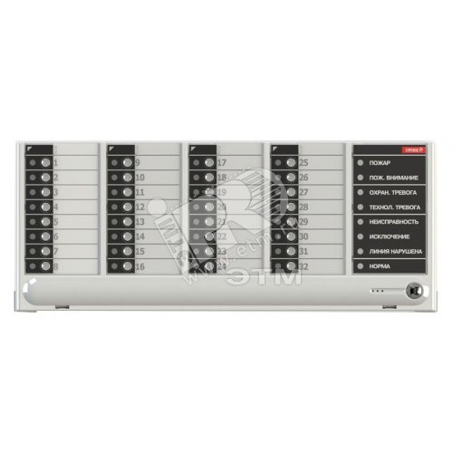 Предназначен для отображения состояния и управления устройствами системы имеется 32 адресных индикатора, 32 кнопки с программируемым действием по нажатию и 8 индикаторов состояния. Для идентификации пользователя поддерживается подключение считывателей ключей Touch Memory или бесконтактных карт по интерфейсу Touch Memory. Блок индикации оснащен встроенным звуковым сигнализатором и кнопкой отключения звука.