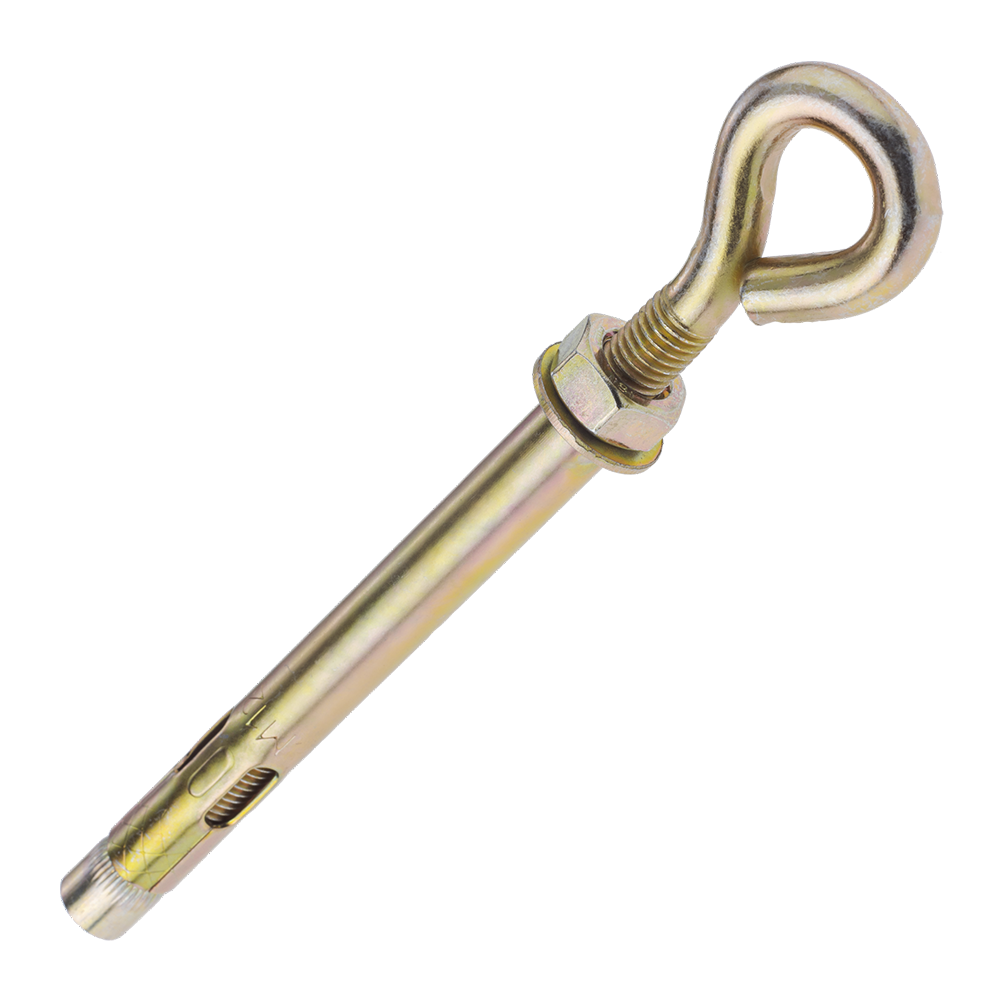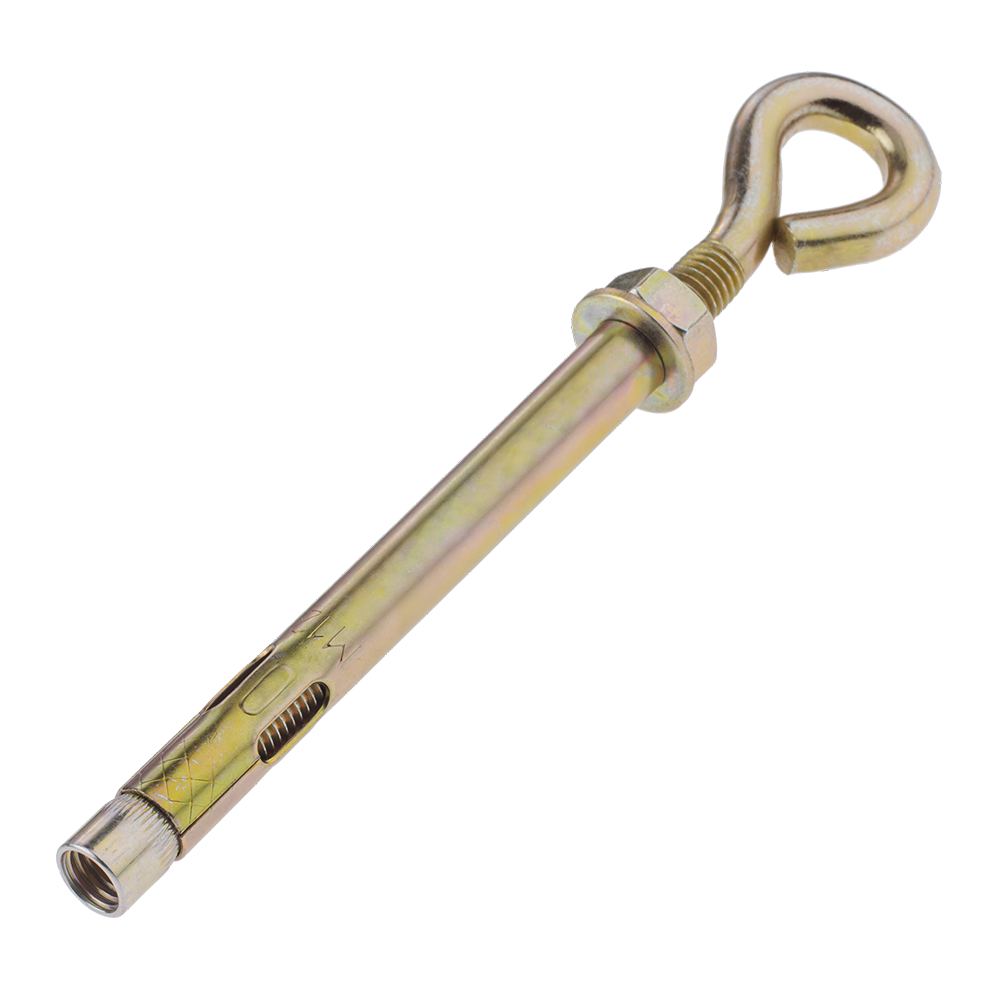 - Преимущества: Изделие состоит из таких элементов как распорный конус с внутренней резьбой, болт с головкой-кольцом, гайка и распорный конус|Анкерный болт с кольцом пользуется большой популярностью, за счет удобства монтажа и надежности крепления|Экономия времени и легкое расклинивание молотком|Специальный принцип действия обеспечивает простой ударный монтаж и экономию рабочего времени