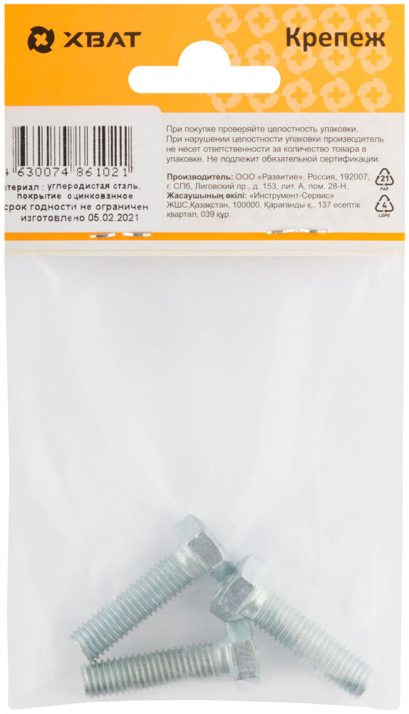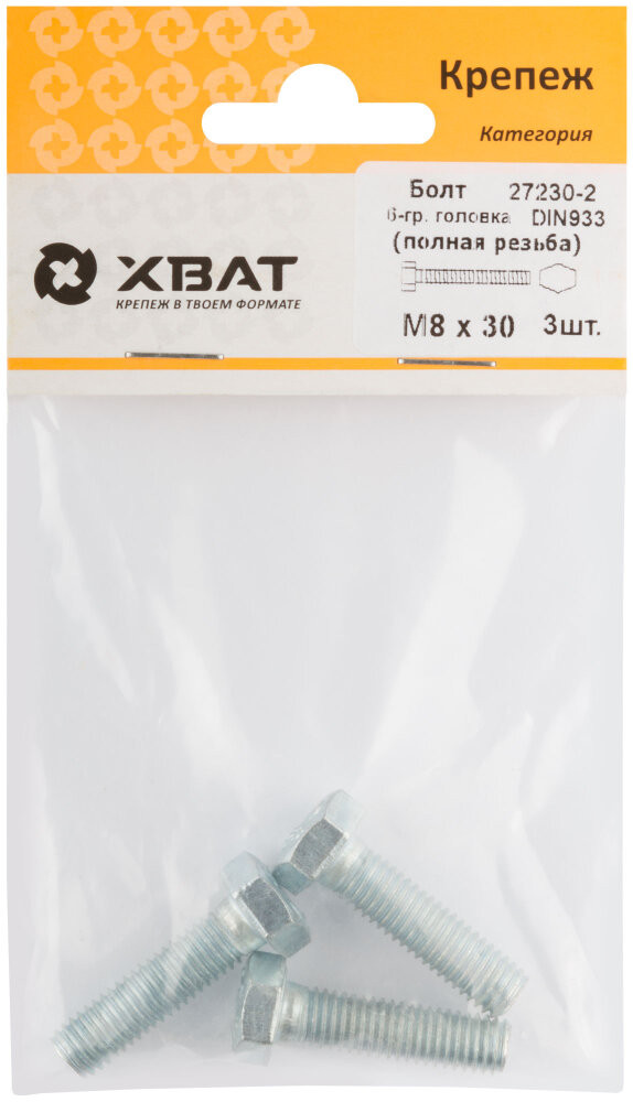 Болт DIN933 М8х30 шестигранная голова полная резьба оцинкованный (3 шт) (ХВАТ) 27230-2