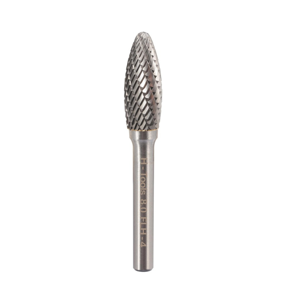Бор-фрезы твердосплавные H-Tools используется для высокоскоростной чистовой обработки - снятия фаски и удаления заусенцев в отверстиях, плоского шлифования и обработки глухих отверстий, контуров и торцевых поверхностей, для зачистки швов после сварки, для резки твердых сталей, снятия облоя с металла, а также возможна обработка формованных деталей, матриц, пресс-форм. В качестве привода применяют - бормашины, дрели, прямые шлифовальные машины с электрическим и пневматическим приводом. Изготовлены из высококачественного мелкозернистоготвердосплава на высокоточном оборудовании. Форма H (пламевидная) применяется для обработки формованных деталей. Бор-фрезы применяют при обработки углеродистой, хромоникелевой и нержавеющей стали до 1300 МПа, латуни, бронзы, меди, сварных швов и титана.