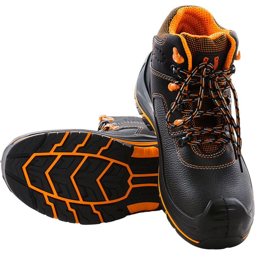Ботинки PERFECT PROTECTION. Изготовлены из термоустойчивой водоотталкивающей кожи (юфти). Подошва – двухслойная, устойчивая к воздействию нефти, нефтепродуктов, щелочей концентрации до 20 процентов, повышенных температур. Верхний слой из полиуретана обладает амортизирующими свойствами, гасит ударные нагрузки, а также придает обуви легкость, комфортность и повышенные теплозащитные свойства. Ходовой слой изготовлен из износостойкой, термостойкой, морозостойкой резины на основе нитрильного каучука с улучшенным сопротивлением скольжению, стойкостью к деформациям, истиранию. Для защиты от ударов в носочной части стопы в обуви применяется композитный подносок, имеющий конфигурацию, препятствующую надавливанию верхнего края на стопу, и оборудованный прокладкой из полиуретана.