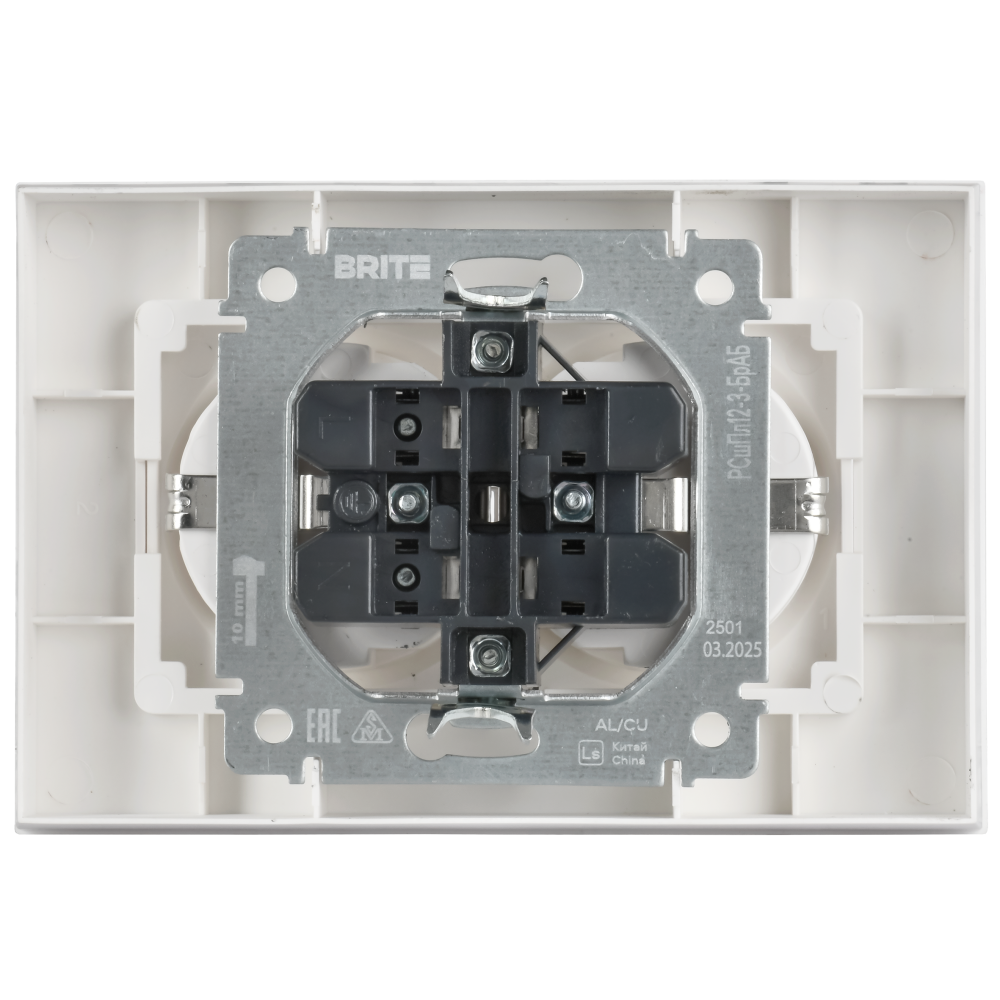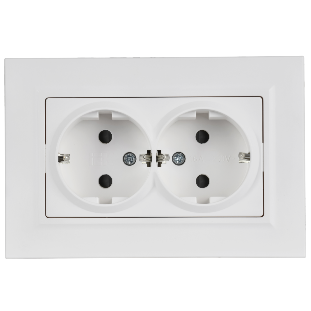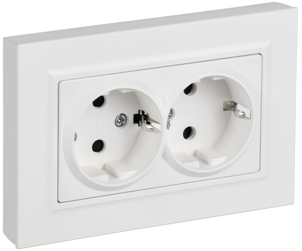 Полное описание товара BRITE Розетка 2-местная с заземлением с защитными шторками плоская 16А в сборе РСшПл12-3-БрАБ арктический белый IEK (IEK) BR-R28-16-K91-F