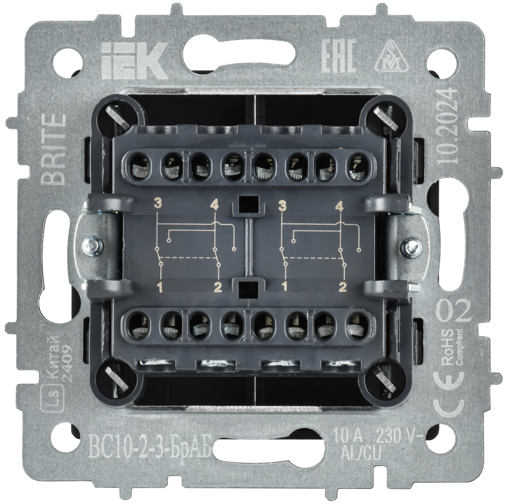 Полное описание товара BRITE Выключатель 2-клавишный перекрестный 10А ВС10-2-3-БрАБ арктический белый IEK (IEK) BR-V23-0-10-K91
