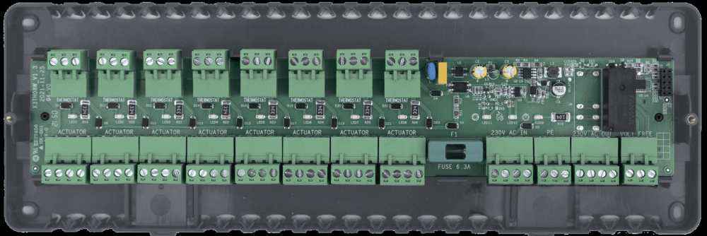 Управляет работой сервоприводов в соответствии с данными, посылаемыми комнатными терморегуляторами. Имеет быстросъемные клеммы и удобную форму.