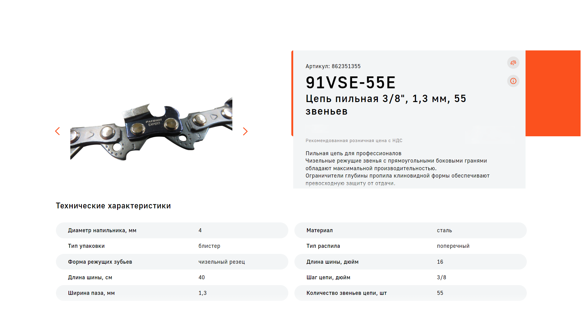 Полное описание товара Цепь пильная EXPERT 91VSE-55E, 3/8 1,3 55 звеньев (блистер) (Patriot) 862351355