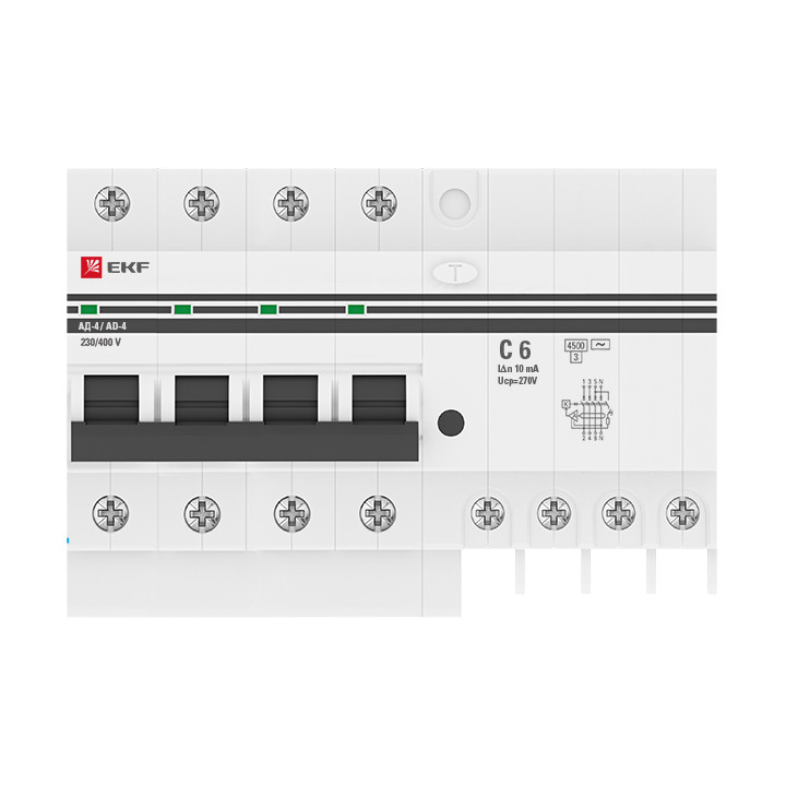 Полное описание товара Дифференциальный автомат АД-4 6А/10мА (х-ка C, АС, электронный, защита 270В) 4,5кА PROxima (EKF) DA4-06-10-pro