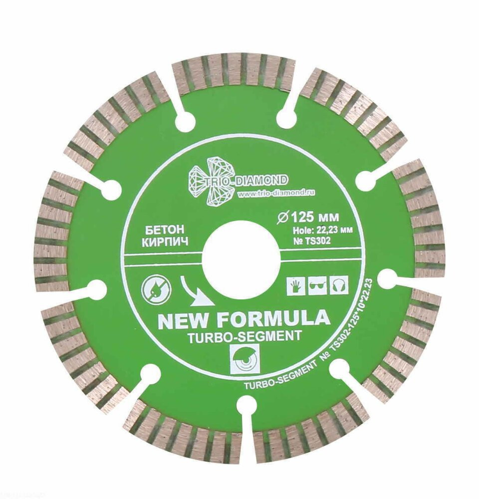 125 Диск алмазный сегментный-турбо Trio-Diamond New Formula Turbo-Segment Диаметр – 125, Посадка – 22.23, Высота кромки – 10, Толщина кромки – 2.2, Сегментов – 9, Сухой/мокрый рез. Предназначен для работы с бетоном, бордюрным камнем, кирпичом, тротуарной плиткой, гранитом. Диски сочетают в себе лучшие качества дисков Turbo (скорость реза) и Segment (повышенная износостойкость).