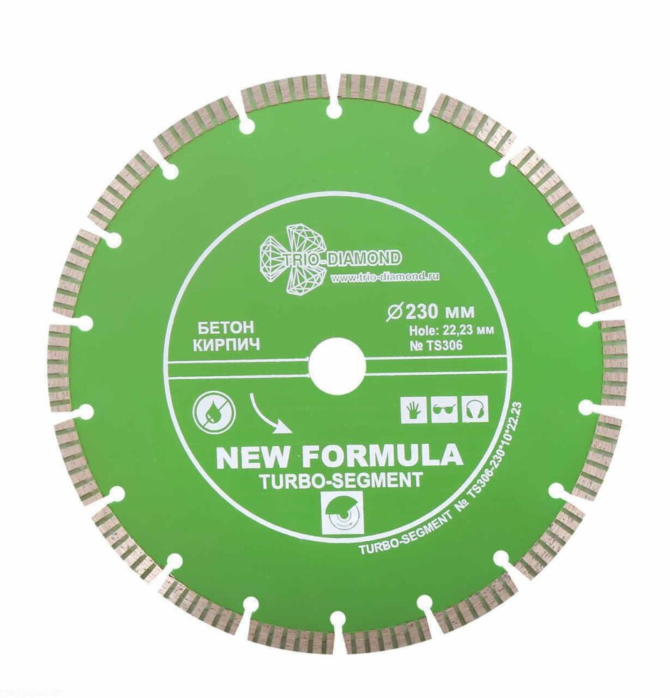 230 Диск алмазный сегментный-турбо Trio-Diamond New Formula Turbo-Segment Диаметр – 230, Посадка – 22.23, Высота кромки – 10, Толщина кромки – 2.7, Сегментов – 18, Сухой/мокрый рез. Предназначен для работы с бетоном, бордюрным камнем, кирпичом, тротуарной плиткой, гранитом. Диски сочетают в себе лучшие качества дисков Turbo (скорость реза ) и Segment (повышенная износостойкость).