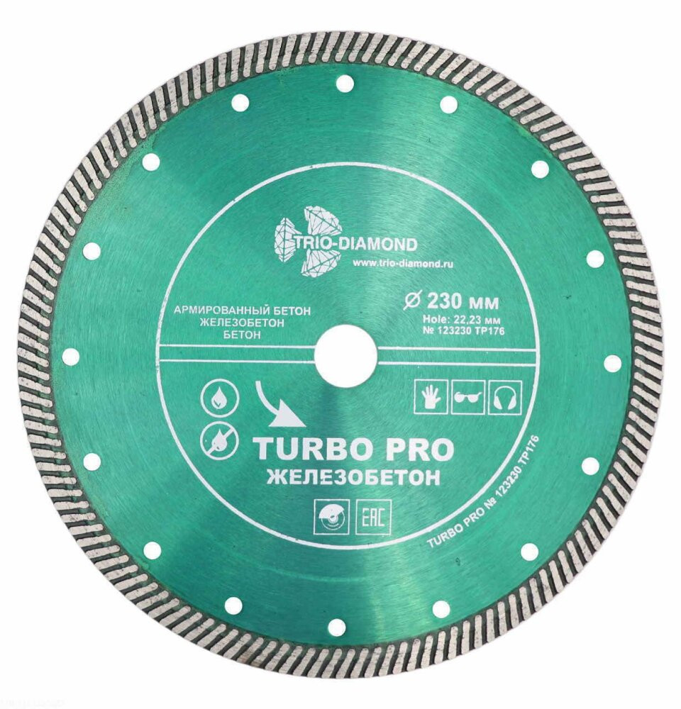 Полное описание товара Диск алмазный отрезной 230х22,23 Турбо Железобетон (TRIO-DIAMOND) TP176