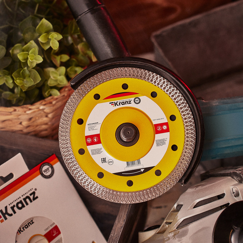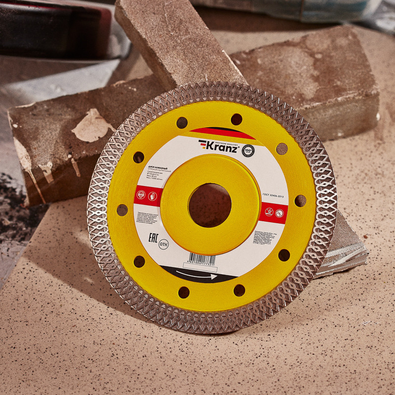 Диск алмазный отрезной ультратонкий 125x22.2 мм KRANZ предназначен для сухой и мокрой резки строительных материалов, таких как гранит, керамогранит, песчаник, клинкер, мрамор, керамика. Используется в угловой шлифовальной машине, ручном электрическом плиткорезе. Материал изделия - инструментальная сталь, синтетический алмаз. Процесс резки сопровождается воздушным охлаждением. Срок годности не ограничен. Хранить в сухом прохладном месте. Использовать строго по назначению. Внимание. Запрещается использовать диск для разрезания металлов. При установке диска руководствуйтесь стрелкой направления вращения диска. Используйте средства индивидуальной защиты. Не утилизировать с бытовыми отходами.