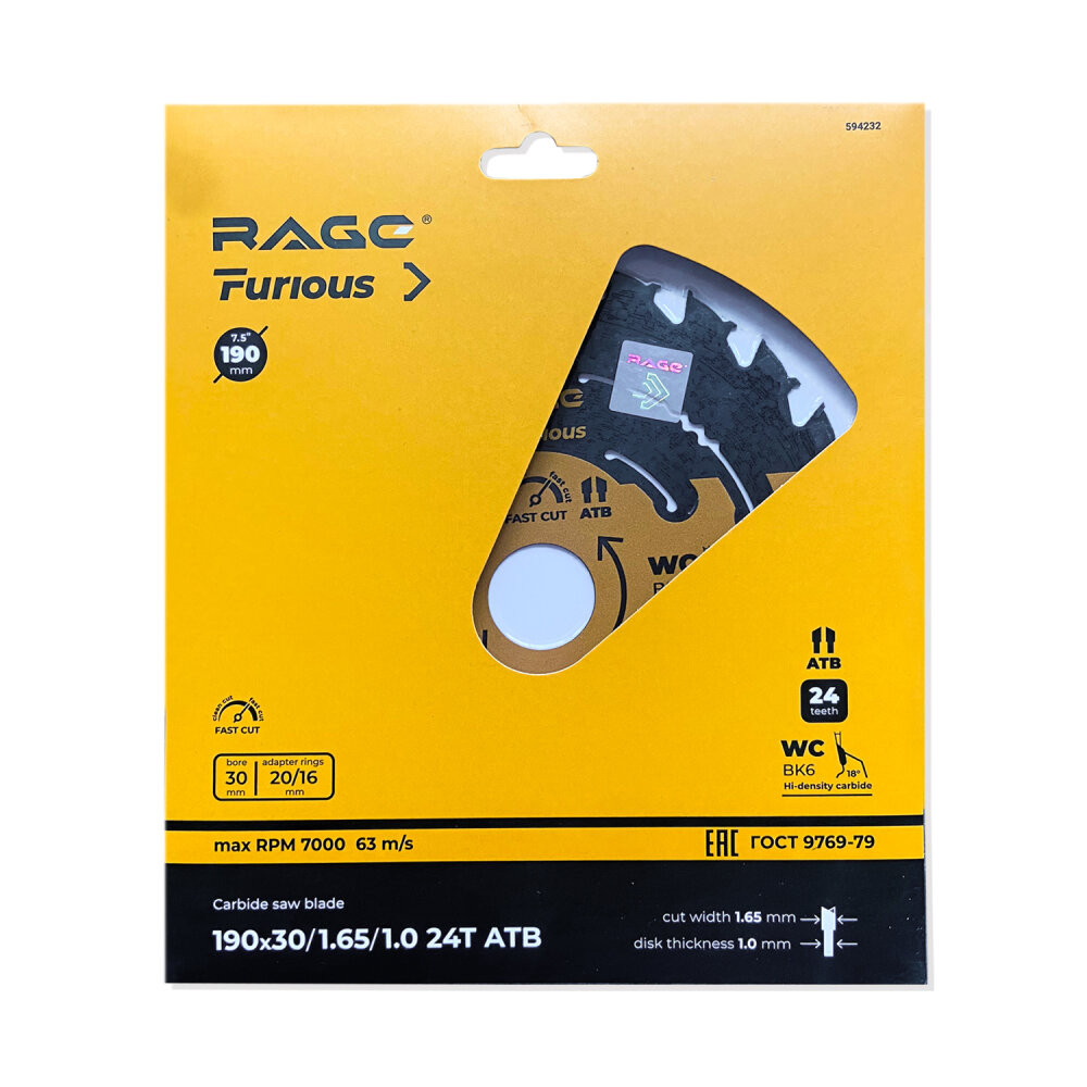 Диск пильный быстрый 190 мм 24 зуба посадка 30 мм + кольцо 20/16 мм (Rage Furious) 594232