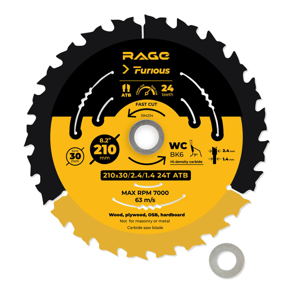 Диск пильный быстрый 210 мм 24 зуба посадка 30 мм + кольцо 25.4 мм 20мм 16 мм (Rage Furious) 594234