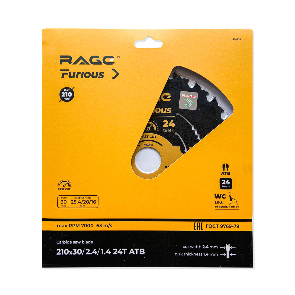 Полное описание товара Диск пильный быстрый 210 мм 24 зуба посадка 30 мм + кольцо 25.4 мм 20мм 16 мм (Rage Furious) 594234
