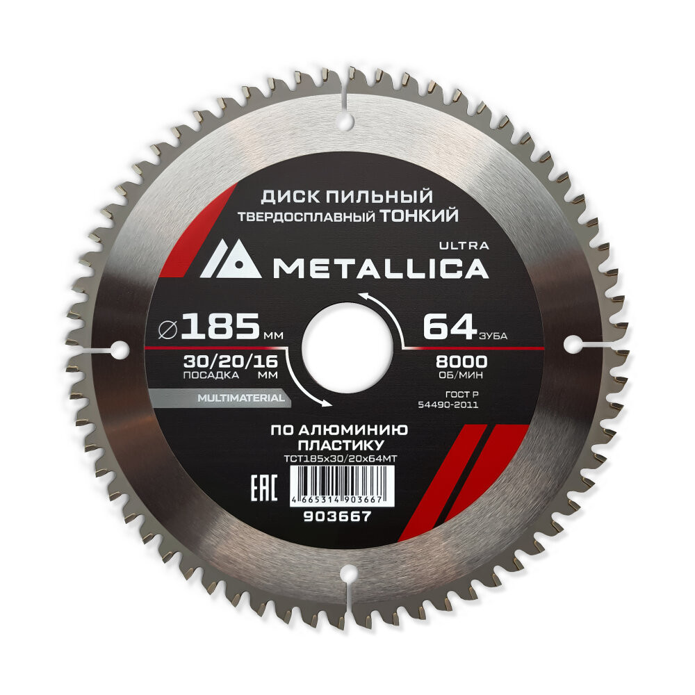 Диск пильный ТОНКИЙ тв. спл. 185x30/20/16 мм, 64 зуб, Т=2,0 мм по алюминию, пласт. (METALLICA) 903667