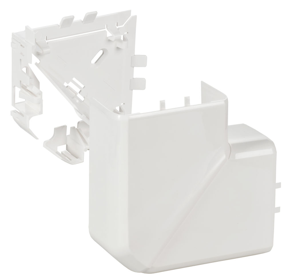 Плоский угол предназначен для соединения двух кабель-каналов одинакового сечения под плоским углом 85–95°. Позволяет избежать разрезания кабель-канала под острым углом, обеспечивает степень защиты IP40, улучшает внешний вид и скрывает место разреза. Угол защёлкивается на корпус кабель-канала. Допускается установка на кабель-каналы с разделительными/несущими перегородками или без них. Цвет: белый