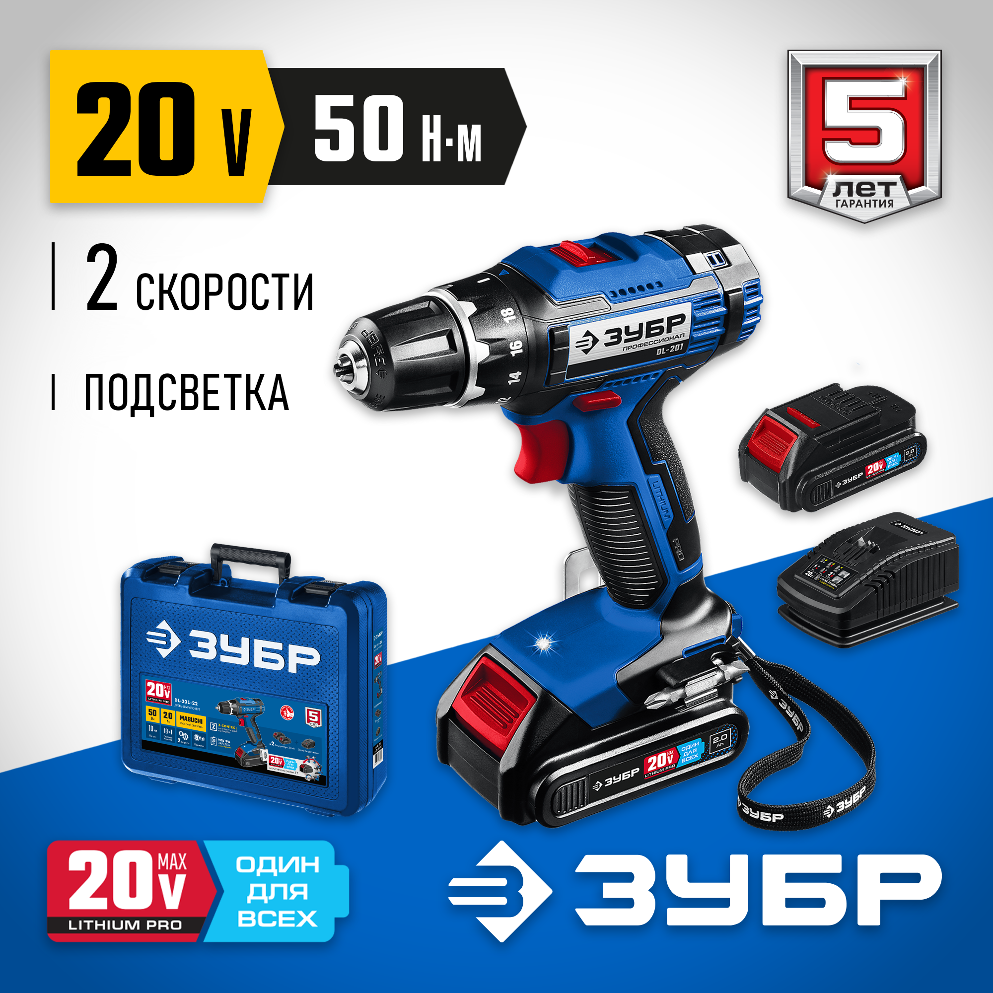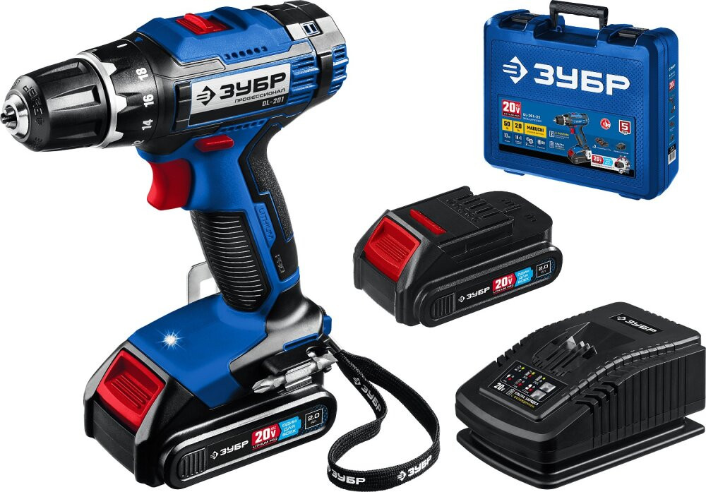 Дрель-шуруповерт 20В, 2 АКБ (2Ач), в кейсе, Профессионал (ЗУБР) DL-201-22