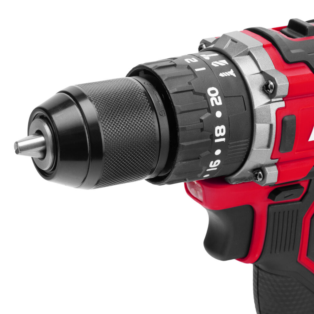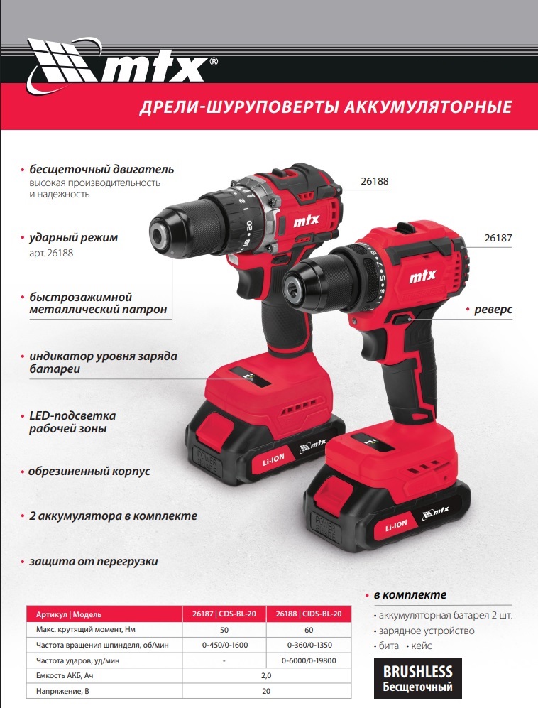 Аккумуляторная ударная дрель-шуруповерт MTX CIDS-BL-20 26188 работает от аккумулятора Li-Ion 20 В емкостью 2 А·ч и предназначена для закручивания и откручивания винтов, саморезов, шурупов, а также сверления отверстий диаметром до 25 мм в древесине и до 10 мм - в металле и бетоне. Ударный механизм позволяет справляться с твердыми материалами, такими как кирпич и бетон. В патрон устанавливается оснастка с диаметром хвостовика 0,8-10 мм. Максимальный крутящий момент составляет 60 Н·м (предусмотрена 20+1 ступень регулировки), что позволяет затягивать крепеж с необходимым усилием.