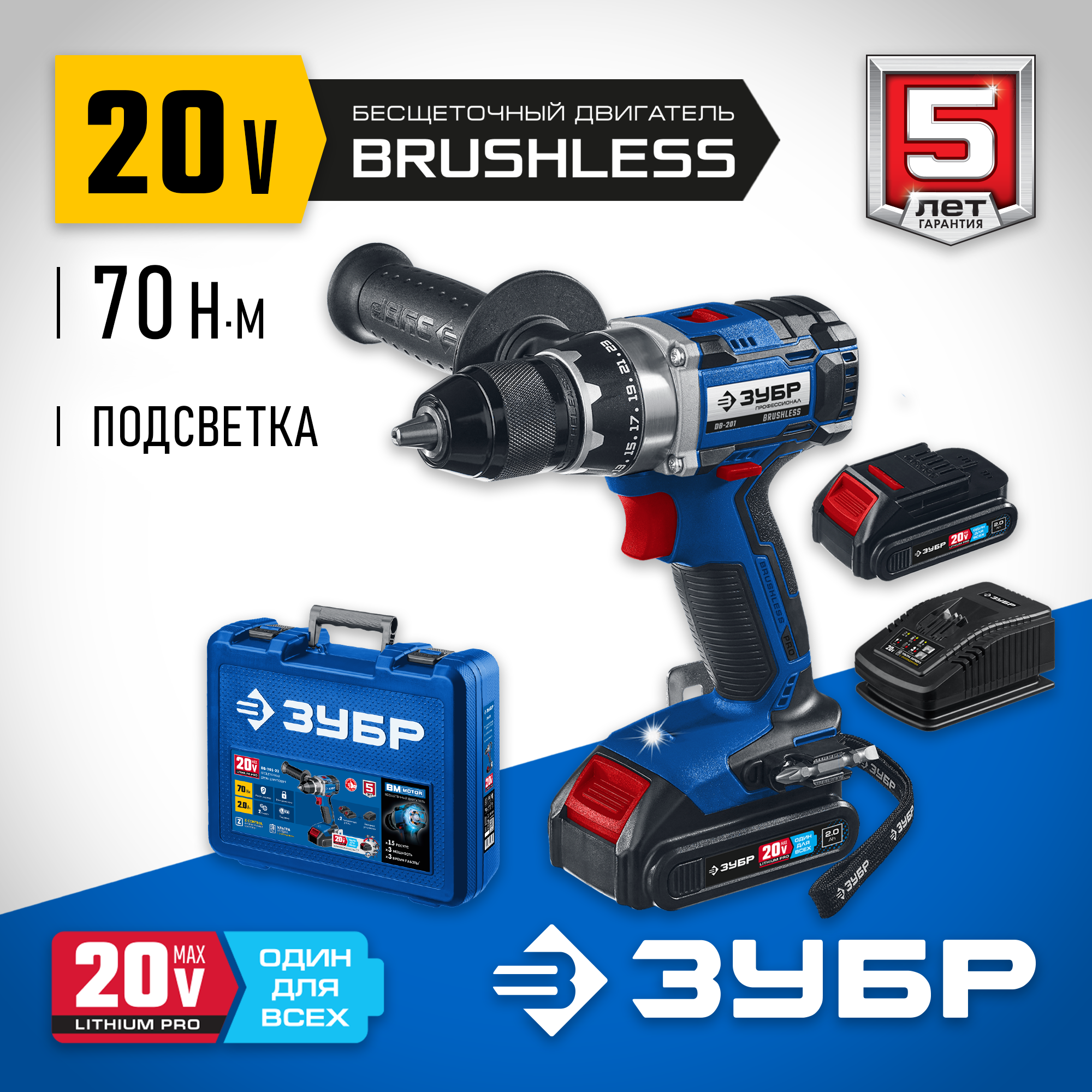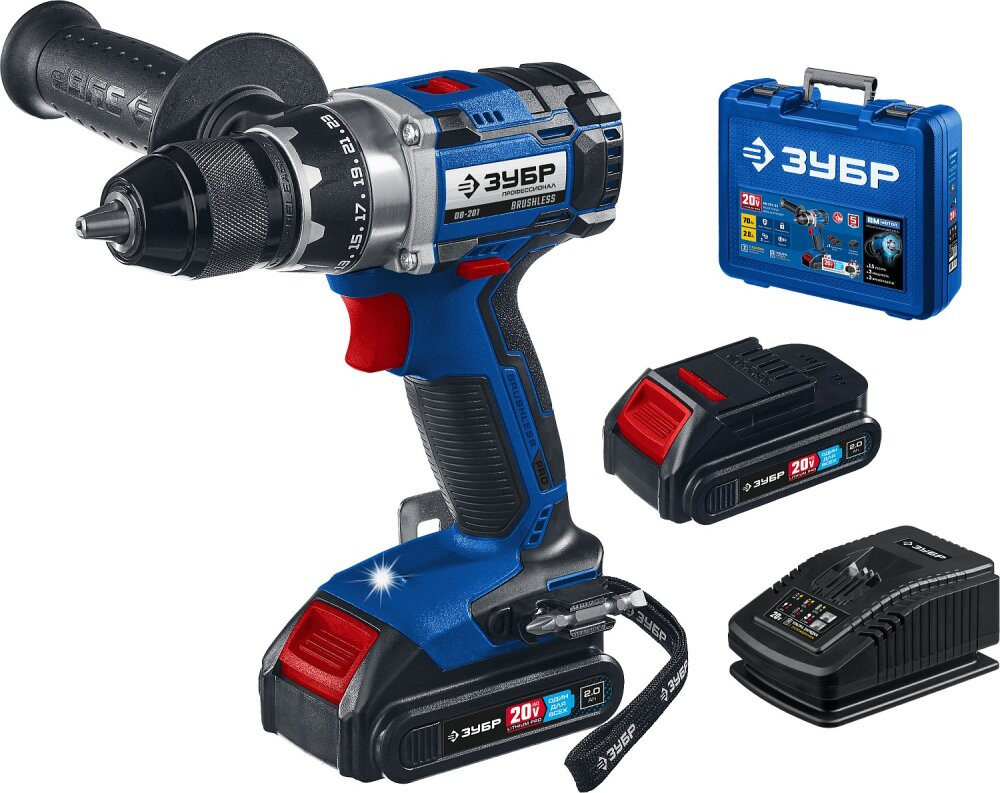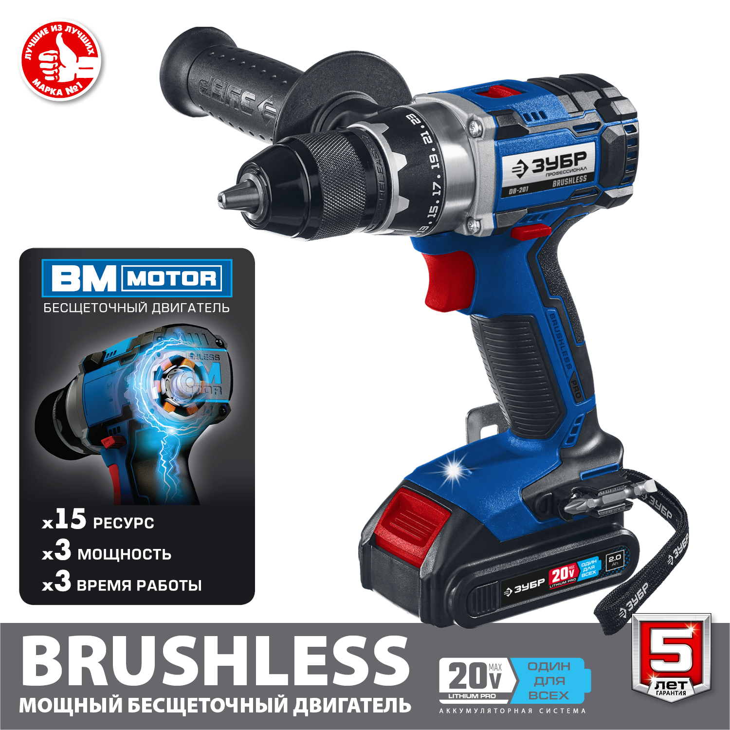Дрель-шуруповерт бесщеточная 20В, 2 АКБ (2Ач), в кейсе, Профессионал (ЗУБР) DB-201-22