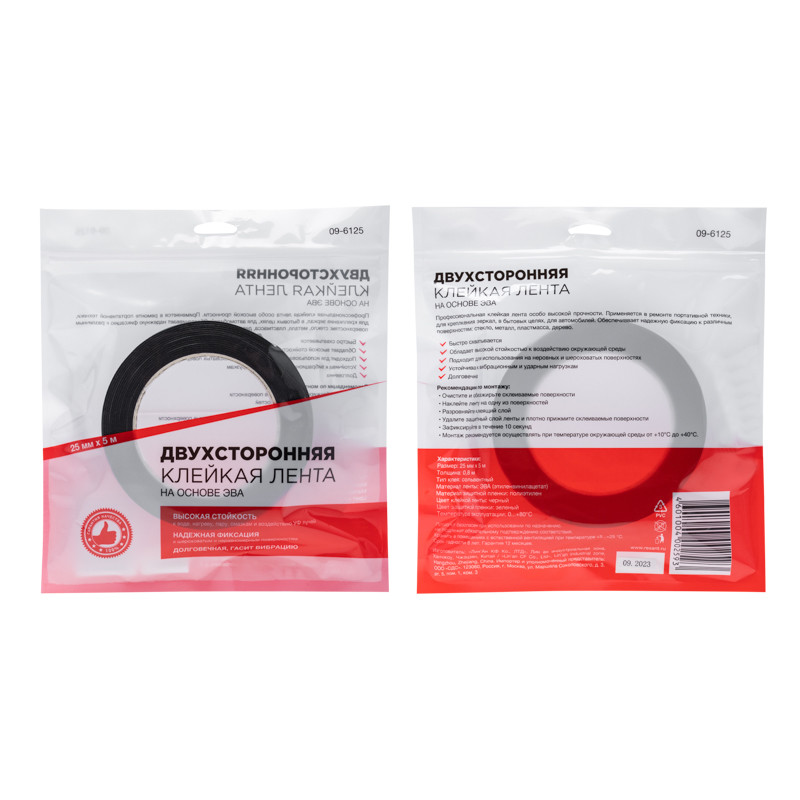 Двухстороння клейкая лента на основе ЭВА (вспененного полиэтилена) применяется для склеивания различных по структуре поверхностей. Благодаря вспененной основе лента повторяет форму рельефа и заполняет его неровности. Полиэтиленовая лента отличается высокой адгезией, поэтому хорошо фиксирует материалы на длительный срок. Максимальная величина адгезии достигается через сутки после склеивания предметов. Устойчива к ультрафиолетовому излучению, маслам, пластификаторам и растворителям. Обладает хорошей прочностью на разрыв и растяжение.