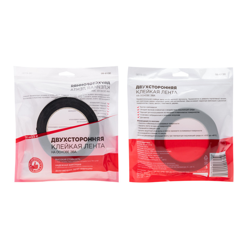 Двухстороння клейкая лента на основе ЭВА (вспененного полиэтилена) применяется для склеивания различных по структуре поверхностей – благодаря вспененной основе лента повторяет форму рельефа и заполняет его неровности. Полиэтиленовая лента отличается высокой адгезией, поэтому хорошо фиксирует материалы на длительный срок. Максимальная величина адгезии достигается через сутки после склеивания предметов. Устойчива к ультрафиолетовому излучению, маслам, пластификаторам и растворителям. Обладает хорошей прочностью на разрыв и растяжение.