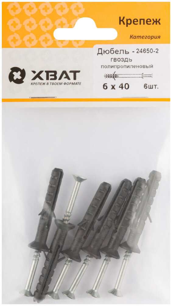 Полное описание товара Дюбель-гвоздь 6х40 потайной бортик, полипропилен (6шт) (ХВАТ) 24650-2