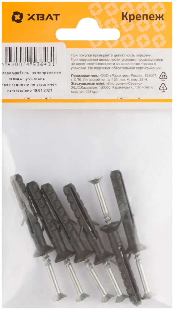 Дюбель-гвоздь 6х40 потайной бортик, полипропилен (6шт) (ХВАТ) 24650-2