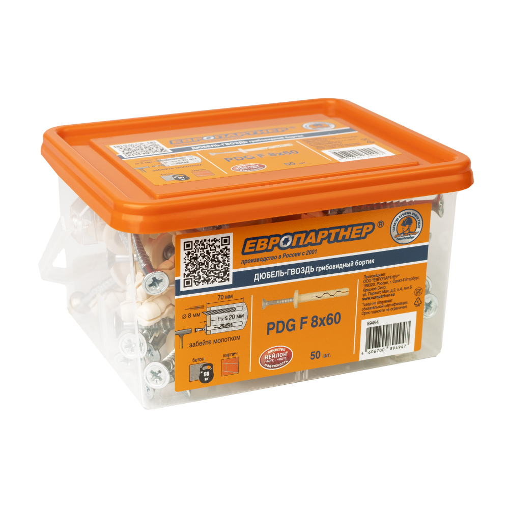 Полное описание товара Дюбель-гвоздь нейлоновый PDG F с грибовидной манжетой 8х60 (50 шт) (Европартнер) 89494