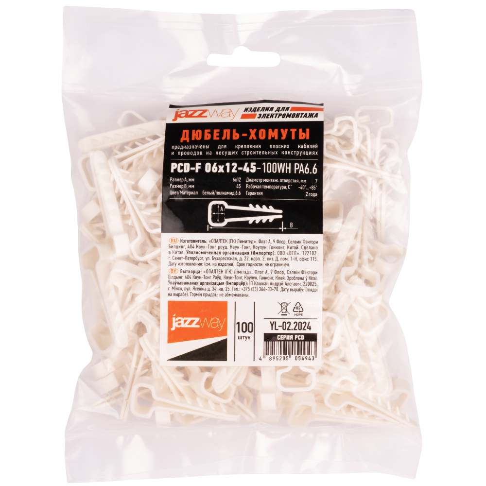 Полное описание товара Дюбель-хомут для плоского кабеля белый PCD-F 06x12-45-100WH PA6.6 Jazzway (100 шт/уп) Jazzway (JazzWay) 5054943