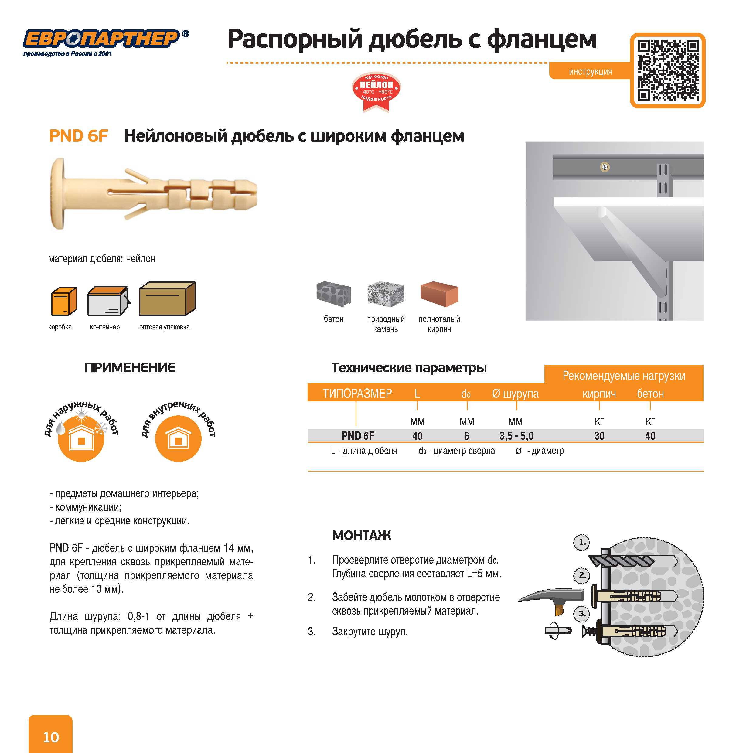 Полное описание товара Дюбель нейлоновый PND-6F 6х40 с широким фланцем (100шт) (Европартнер) 86860