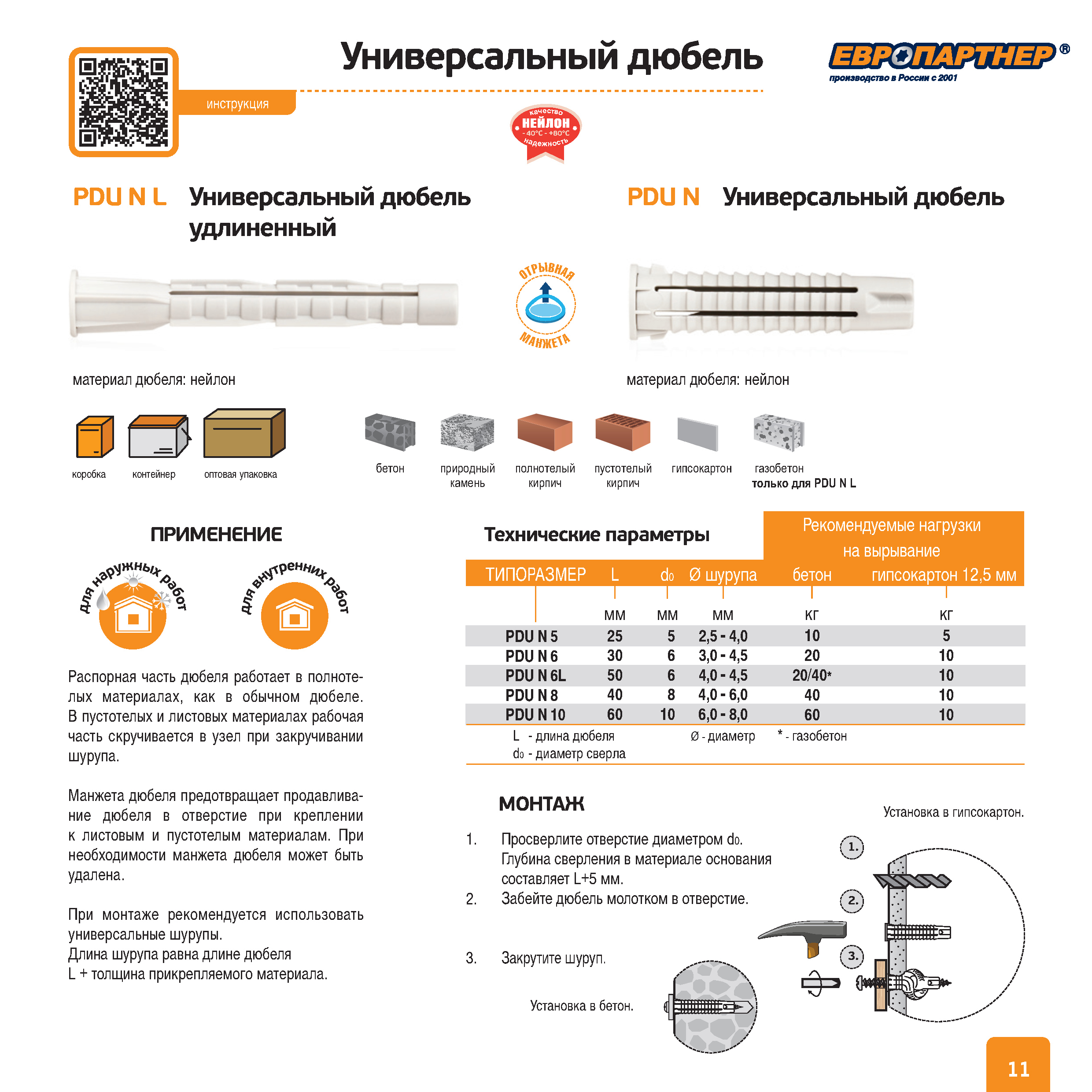 PDU N - это универсальный нейлоновый дюбель, который используется для креплений в бетон, камень, полнотелый и пустотелый кирпич, гипсокартон. Распорная часть дюбеля PDU N работает в полнотелых материалах как в обычном дюбеле. В пустотелых и листовых материалах рабочая часть заворачивается в узел при затягивании шурупа. Манжета дюбеля предотвращает продавливание дюбеля в отверстие при креплении к листовым и пустотелым материалам. При необходимости манжета дюбеля может быть удалена. Его назначение – прочная фиксация компонентов конструкций, выполненных из пластика, древесины, металла к кирпичным, каменным и бетонным основаниям. Применяется для крепления коммуникаций, мебели, элементов декора интерьера, подвесных конструкций, телевизионной и аудио аппаратуры, сантехники, щитового оборудования, приборов обогрева и вентиляции, систем безопасности, настенного освещения.