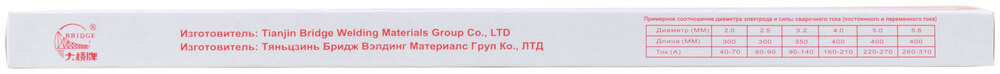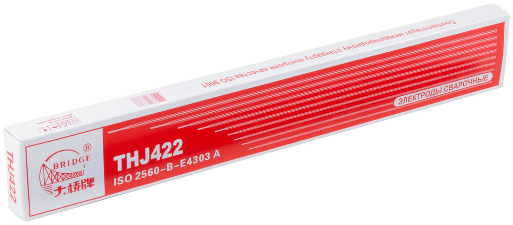 BRIDGE THJ422 — сварочный электрод с рутиловым покрытием. Подходит как для переменного, так и для постоянного тока. Предназначен для ручной дуговой сварки конструкций из низкоуглеродистых конструкционных сталей с классом прочности Q235. Сварка позиций - PA, PB, PC, PD, PE, PF. Рутиловые электроды при сварке практически не выделяют опасных веществ, в связи с чем не требуют использования принудительной вентиляции и респиратора.