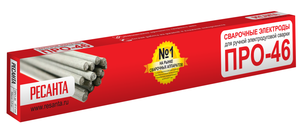 Сварочные электроды РЕСАНТА ПРО-46. Малочувствительны к качеству подготовки кромок свариваемых деталей. Позволяют проводить сварку оцинкованной, окрашенной, загрязненной и слегка ржавой стали, а также на обильно увлажненной поверхности. Обладают повышенной, на 20% большей, прочностью сварного шва по сравнению с электродами марки МР-3 Позволяют выполнять сварку на предельно низких токах во всех пространственных положениях, в том числе ''сверху вниз''. ПРО-46 просты в применении даже для начинающих сварщиков, в сравнении с моделями основных конкурентов, т.к. отличаются более легким начальным и повторным поджигом, мягким и стабильным горением дуги. Малые потери металла от разбрызгивания Отличное формирование металла шва Легкая отделимость шлаковой корки Возможность проводить сварку на переменном и постоянном токах.