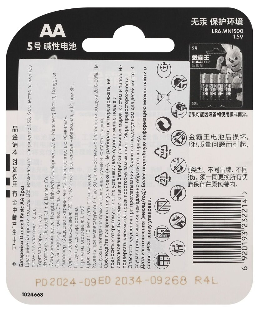 Полное описание товара Элемент питания АА алкалиновый 1,5v 2 шт. LR6-2BL Basic (Duracell) Б0069023
