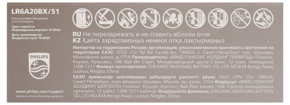- Преимущества: Отлично подходит для устройств с высоким энергопотреблением|Батарея остается годной для использования в течение 10 лет| Удобство использования|Понятные схематические инструкции по эксплуатации|Щелочные батареи Philips не содержат кадмия, ртути и свинца