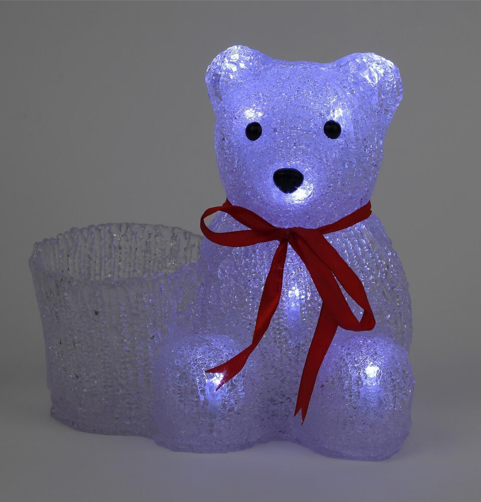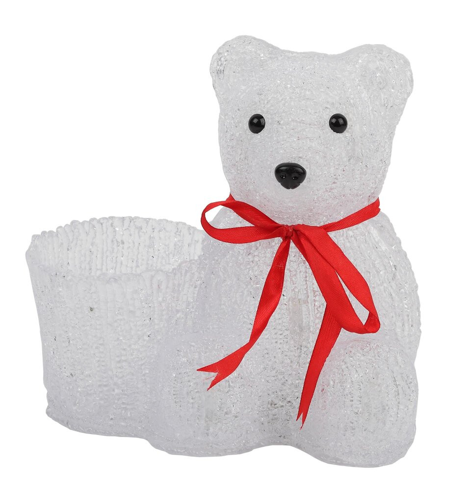 Новогодняя светодиодная фигура ЭРА `Медвежонок с корзинкой` для создания праздничной атмосферы и декорирования интерьера. Работает от 3 мизинчиковых батареек, что даёт возможность украшать пространство без привязки к наличию подходящих розеток. Изготовлена из акрила - крепче и устойчивее многих аналогов. Будет надёжно стоять без дополнительных креплений. Отличается морозостойкостью. LED-фигура представляет собой северного медвежонка с корзинкой, светится холодным белым светом. Дизайн фигуры идеально подходит к зимним праздникам. В корзинку можно положить небольшие сувениры, конфеты или новогодний декор. Размеры фигуры: 21 х 15 х 19 см. Свет создают 10 ярких и экономичных светодиодов, которые не перегреваются даже при длительной работе без перерывов. Новогодняя LED-фигура - простой и быстрый способ создать праздничное настроение, украсить дом, офис, общественное пространство.