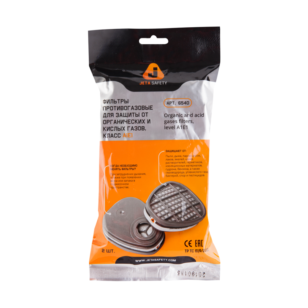 Полное описание товара Фильтр противогазовый Jeta Safety для защиты от органических и кислых газов класса A1Е1, в упаковке 2 шт (Jeta Safety) 6540