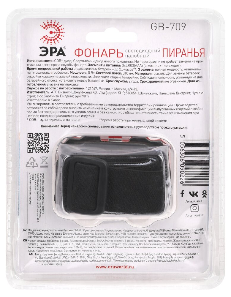 Полное описание товара Фонарь налобный светодиодный 5Вт 310Лм IP40 COB 3 режима на батарейках 3xAAA (в комплект не входят) GB-709 Пиранья (ЭРА) Б0052751