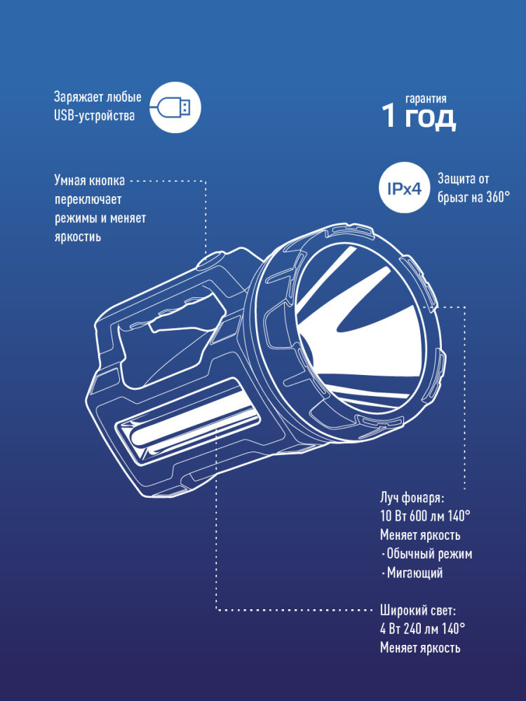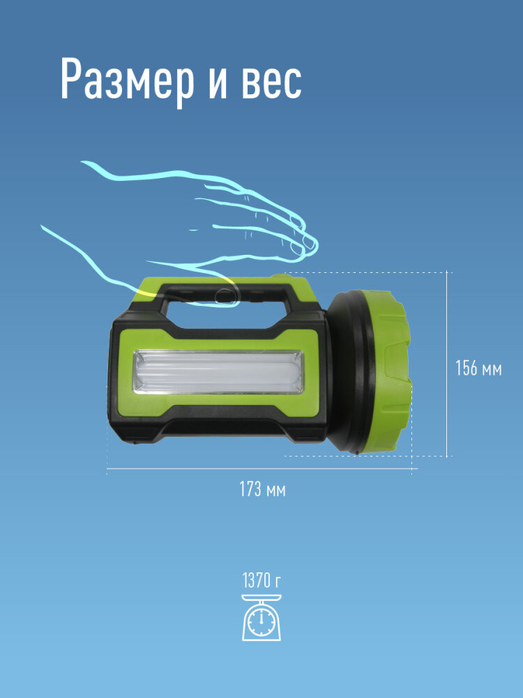 Ручной фонарь 2-в-1 со встроенным светильником на 180 градусов. Рекордная дальность луча - 620 метров, дополнительный вход для шнура автомобильной зарядки. Оба источника света можно регулировать. Функция Power bank - от фонаря можно подзарядить телефон. Совмещает луч фонаря (светит как фара автомобиля, направленный свет с ярким пятном засветки в центре) и широкий свет (освещает широкое пространство с одной стороны, удобен для работы вблизи). Длина луча - 620 м, время беспрерывной работы - 3-10 ч. Площадь освещения светильника - 29 кв. м, время беспрерывной работы - 6,5-15 ч. Надежный свинцово-кислотный аккумулятор 4В 6000 мАч, подзарядка от сети. Упакован в коробку с подробной информацией о модели и схемой фонаря.