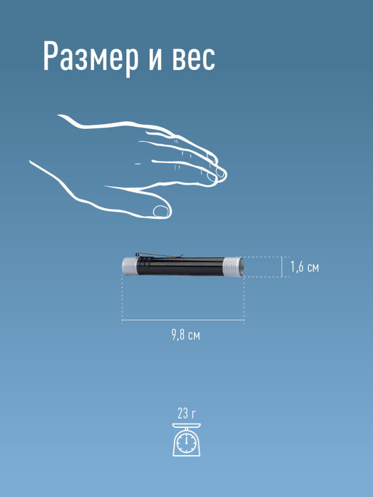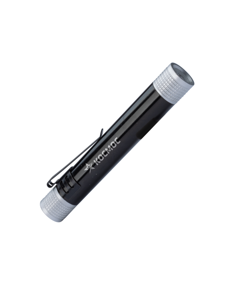 Короткий ручной карманный фонарик КОСМОС (KOS107B) с корпусом из металла – самый компактный в серии фонарей, схожих с шариковой ручкой (удобно иметь в кармане с собой). Удобный зажим для крепления к одежде или на ремень. Луч фонаря – светит вперед, направленный свет. Источник света - 0,5 Вт LED. Источник питания - батарейки 1xAAA (в комплект не входит). Количество режимов - 1 (яркий). Световой поток - 30 лм. Дистанция освещения - 31 м. Корпус - анодированный алюминий, IP54. Компактный карманный размер - 9.8x1.9x1.6 см. Зажим для крепления