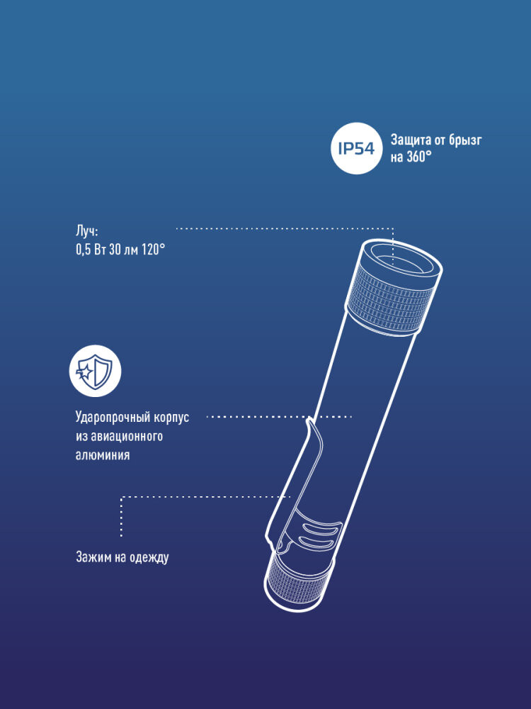 Полное описание товара Фонарь ручной 0,5Вт LED/1xAAА/корпус алюминий/зажим для крепления, (Космос) KOS107B